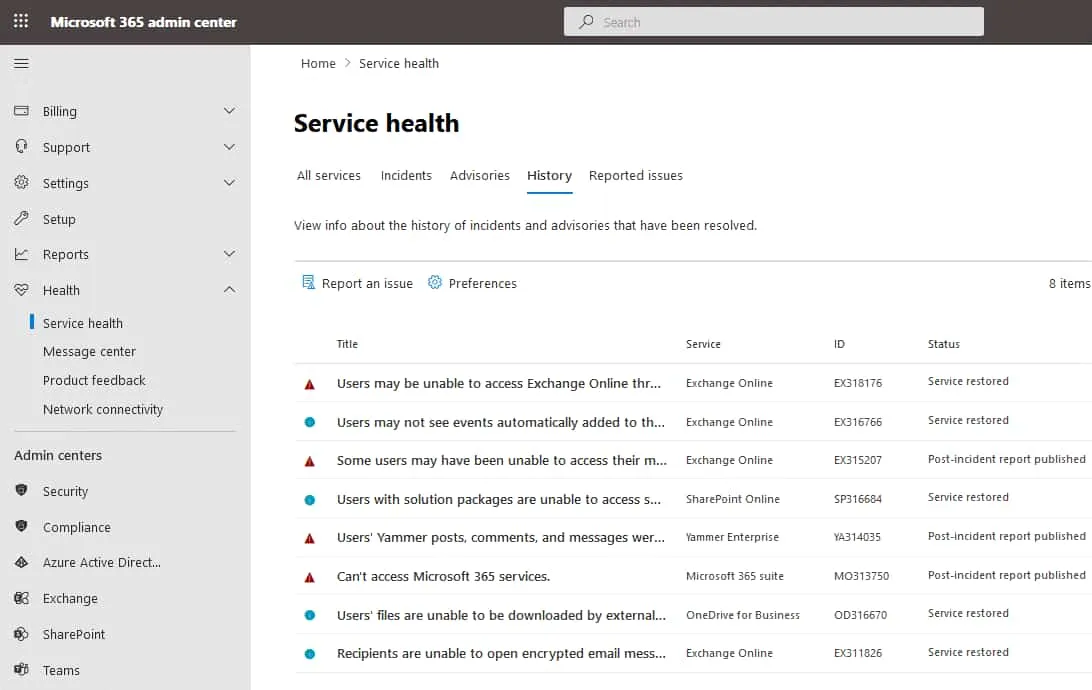 - Select the History tab on the Service Health page to see additional information about logged service interruptions and issues.