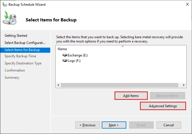 - Select Items for Backup. Select the volume (partition) with the Exchange Server database and the partition with Exchange database log files. It is important that you select a volume (volumes), and not files or folders. Otherwise, you can have issues during the Exchange data recovery process. In our example, .edb files are stored on E: and Exchange database log files are stored on F:.