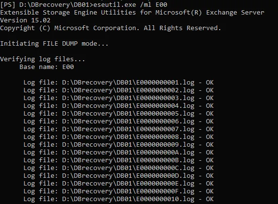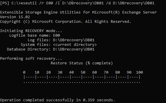 eseutil /r E00 /l D:\DBrecovery\DB01 /d D:\DBrecovery\DB01