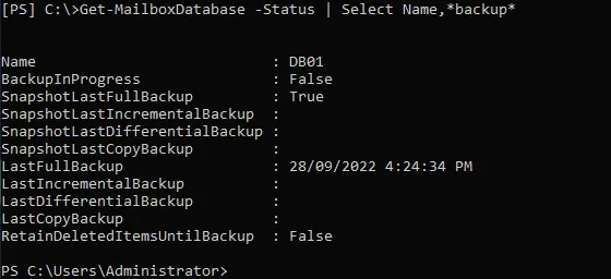 You can check the backup status of the Exchange Server database with the command:Get-MailboxDatabase -Status | Select Name,*backup*