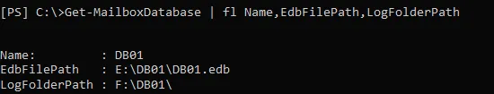 Get-MailboxDatabase | Select Name,EdbFilePath,LogFolderPath