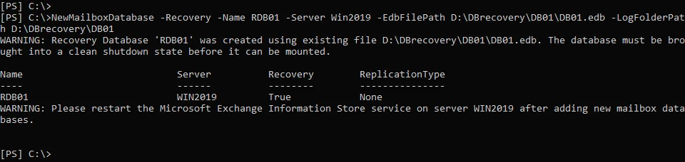 NewMailboxDatabase -Recovery -Name RDB01 -Server Win2019 -EdbFilePath D:\DBrecovery\DB01\DB01.edb -LogFolderPath D:\DBrecovery\DB01