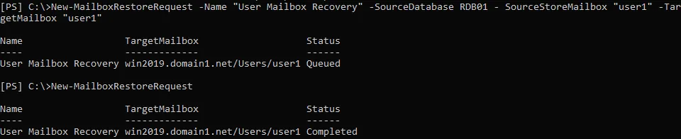 New-MailboxRestoreRequest -Name "User Mailbox Recovery" -SourceDatabase RDB01 - SourceStoreMailbox "user1" -TargetMailbox "user1"