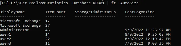 Get-MailboxStatistics -Database RDB01 | ft -AutoSize