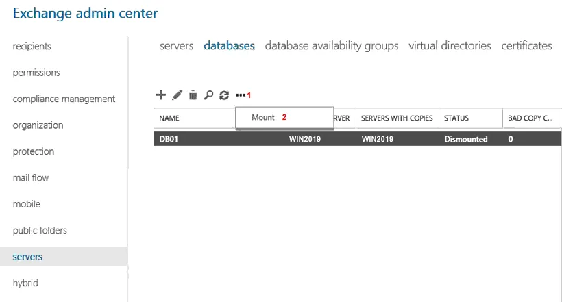 - Recovery Progress. Wait until the Exchange data recovery is completed.After finishing Exchange data recovery from a backup (to the original location in this example), mount the database and check whether the database was restored successfully. You can mount the database in the Exchange Admin center, as shown in the screenshot below.