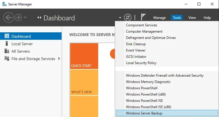- Once Windows Server Backup has been enabled, run this tool from Server Manager: Server Manager > Tools > Windows Server Backup