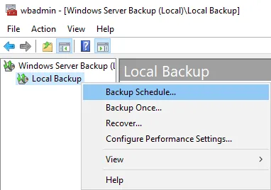 Right-click Local backup in the left pane of the main Windows Server Backup window and click Backup Schedule in the context menu.