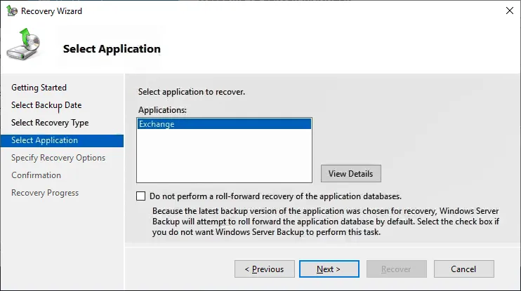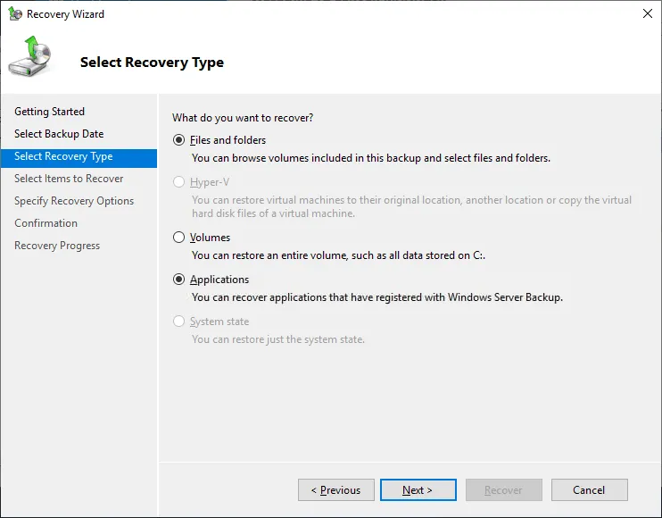 - Select Recovery Type. Select Applications. The Applications option may be inactive (grayed out) if you selected files or folders in the backup settings of Windows Server Backup instead of backing up volumes.