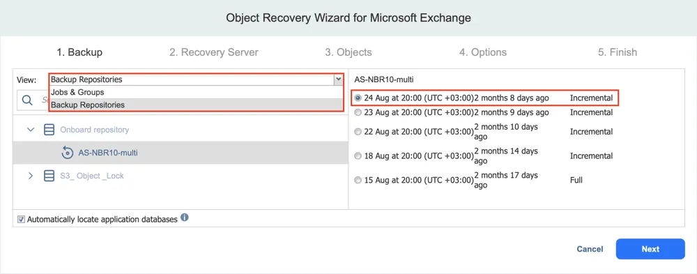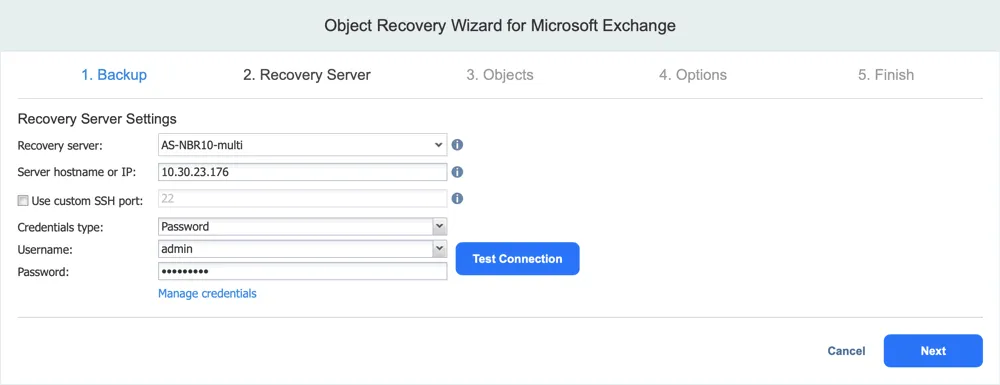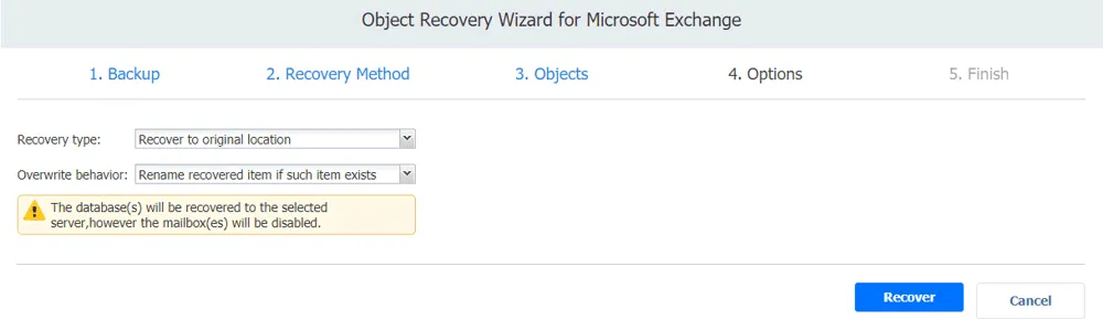 NAKIVO Backup & Replication is a data protection solution that supports Exchange data recovery from a physical or virtual machine backup. You can recover specific Exchange Server objects such as mailboxes and emails as well as perform full Exchange database recovery. The recovery process consists of a few steps performed in the web interface of the product.