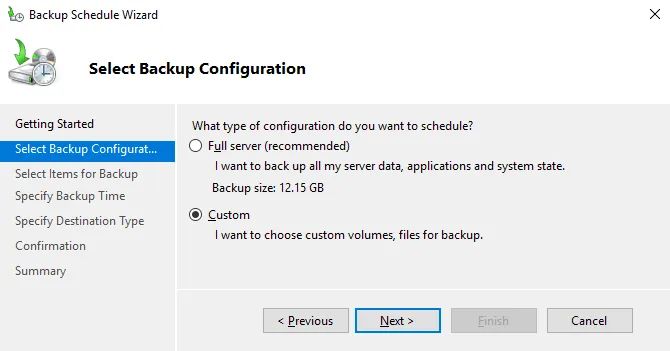 - Select Backup Configuration. Select Custom. Click Next at each step of the wizard to continue.