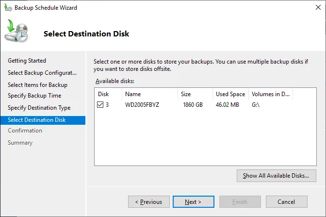 - Select Destination Disk. Select the disk where you want to store the Exchange Server backup. In our case, we use disk G: