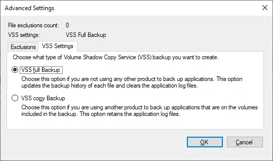Click Advanced Settings. In the Advanced Settings window, select VSS full backup in the VSS Settings tab if you want to truncate Exchange database logs after creating a backup. If you want to preserve logs or you also use another backup application for Exchange backup, select VSS copy Backup.