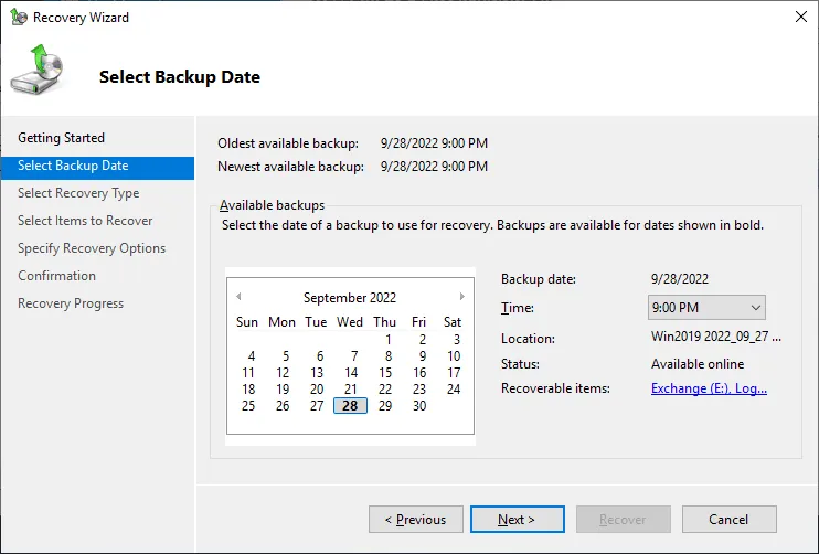 Note: You must have an Exchange Server backup before you can go to Exchange data recovery. You must enable native Windows Server Backup when your Exchange Server is working properly before data loss occurs. If you don’t have a backup, enabling Windows Server Backup for Exchange does not help after an Exchange failure.