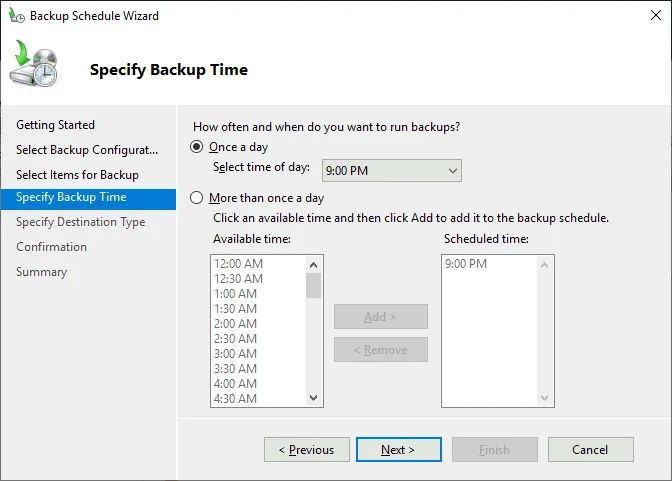 - Specify Backup Time. You can set the time for running a backup. This can be once a day or more frequently.