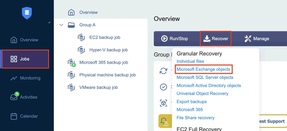 On the main dashboard, click Jobs > Recover > Microsoft Exchange objects to start the Exchange Server recovery process.