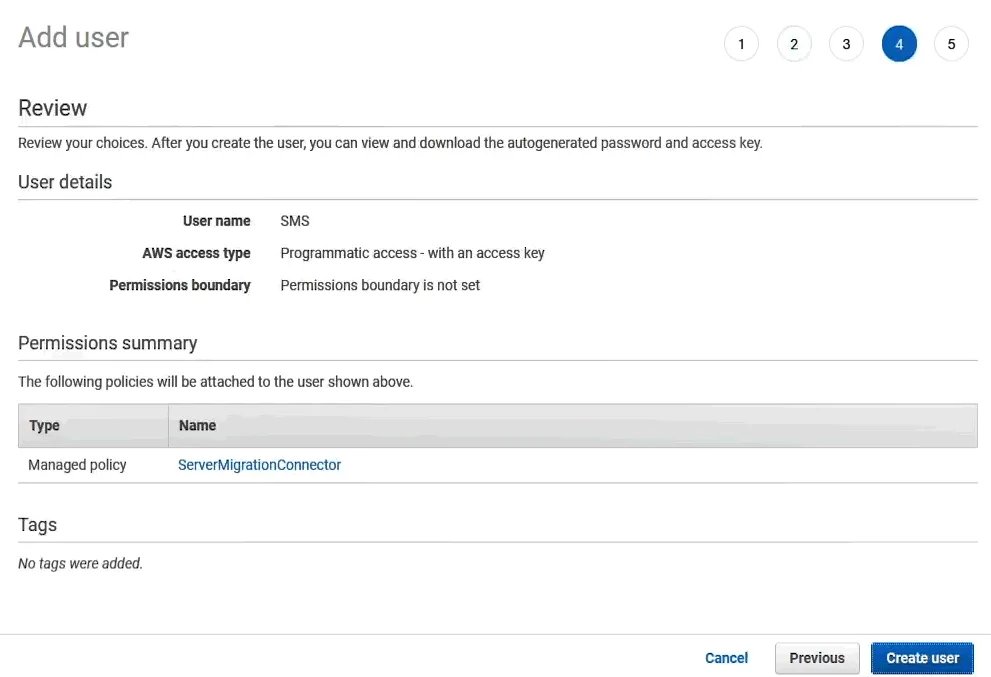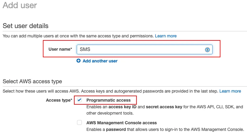 - Set user details. Enter a user name, for example, SMS or migration. Select AWS access type. Make sure you select the Programmatic Access checkbox. There is no need to enable the AWS Management Console access.Click Next: Permissions to continue.