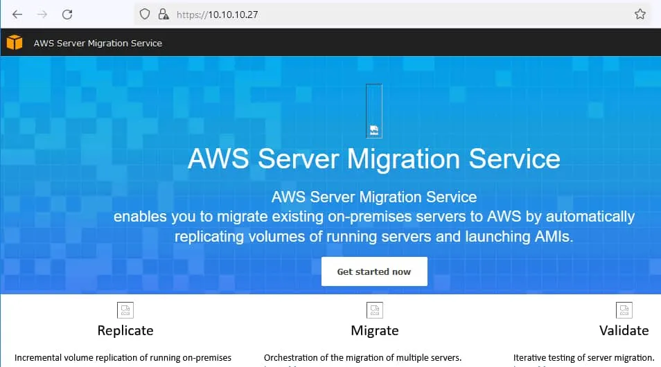 We are redirected to the dashboard page of the AWS Server Migration Service running as a VM in VMware vSphere (10.10.10.27 in our case).