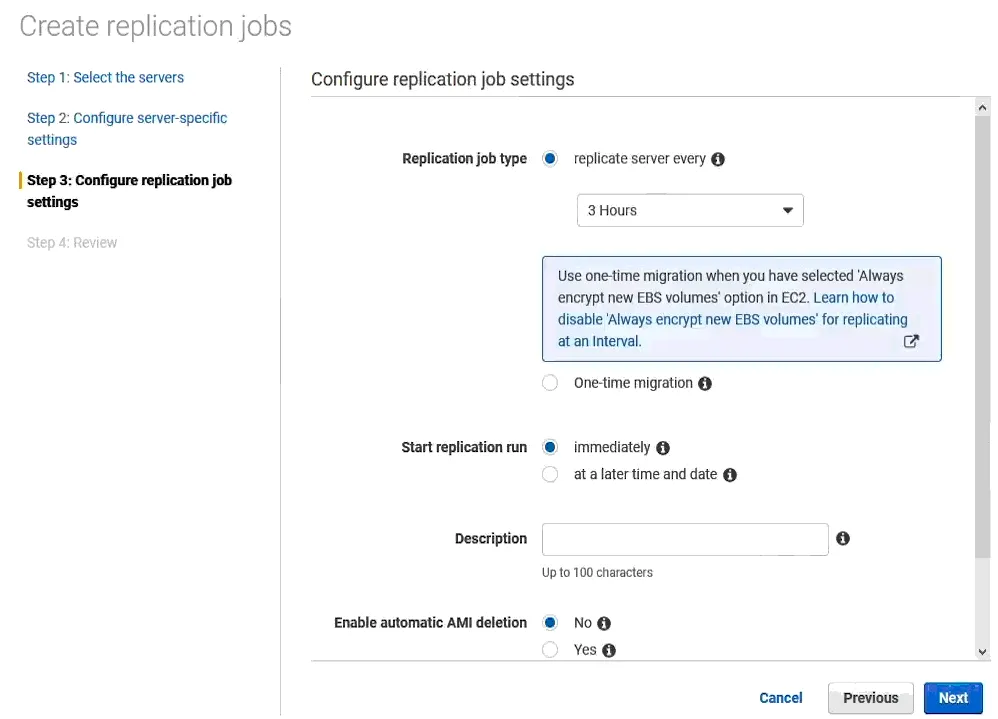 - Configure replication job settings. Select the replication type, start time, IAM service role, AMI deletion options, and other options. In our case, we select One-time migration and start replication immediately to migrate VMware VM to AWS now.