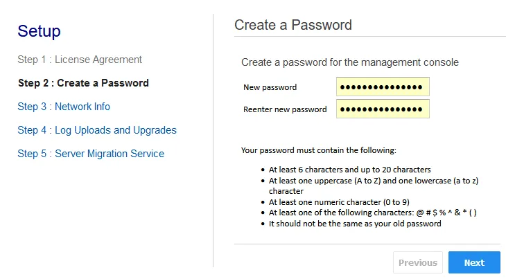 - Create a password. Create a password for the management console of the AWS Connector appliance.