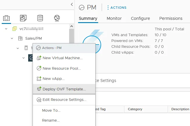 - Use the Host and clusters view in the navigation pane, right-click an ESXi host, cluster or resource pool, and click Deploy OVF Template in the menu that opens.