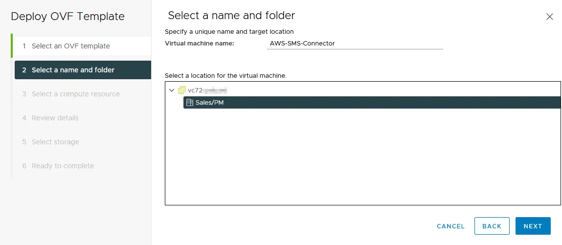 - Select a name and folder. Enter a virtual machine name (you can leave the default name), for example, AWS-SMS-Connector. Select a location for the VM, such as a data center, VM folder, etc.