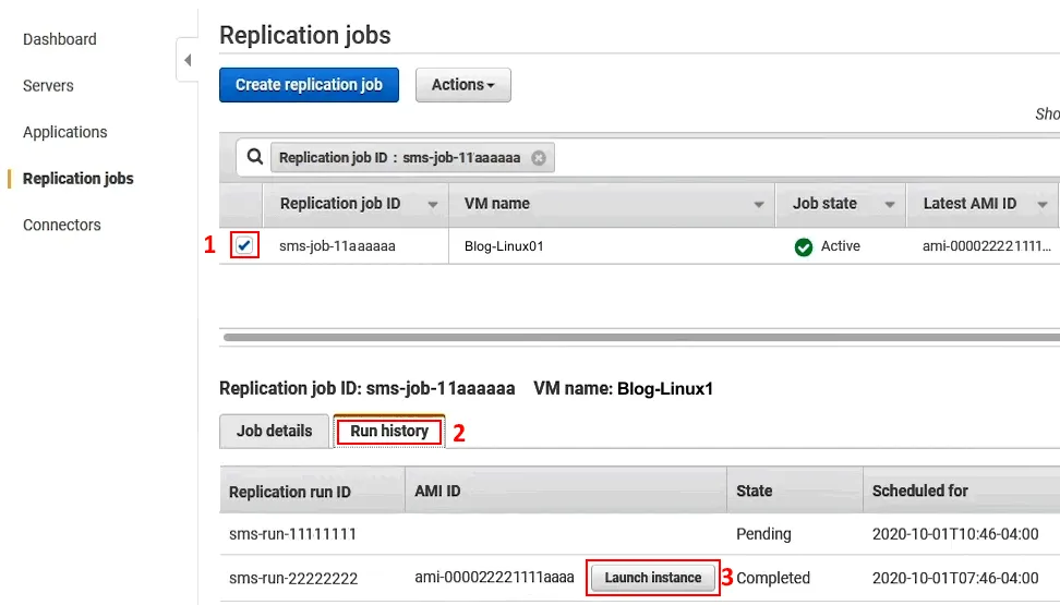 Select the needed Replication job ID which job has already finished. Click Launch instance to create an EC2 instance from the AMI (Amazon Machine Image) created as a result of VM migration from VMware vSphere to AWS. As an alternative, you can click Actions > Launch instance from the latest AMI.