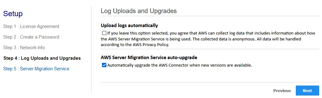 - Log uploads and upgrades. You can leave the AWS Server Migration Service auto-upgrade checkbox selected to keep the AWS SMS up-to-date.