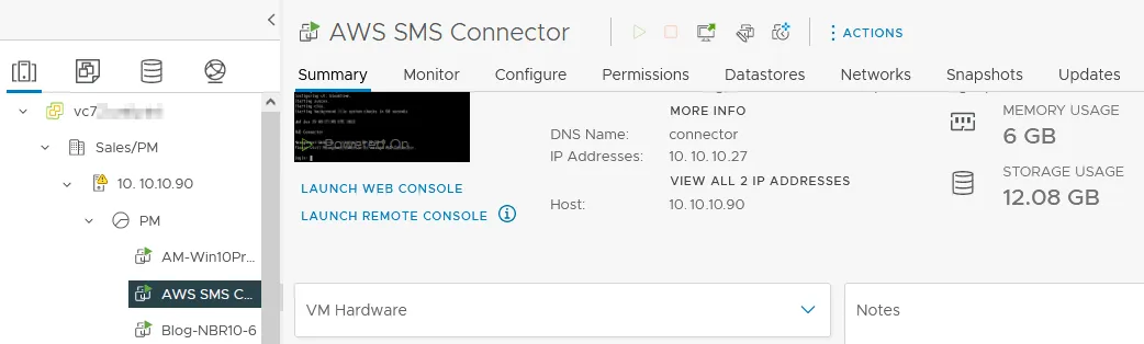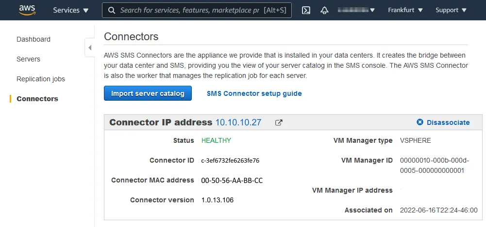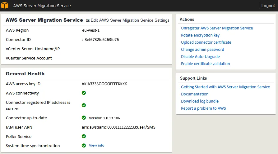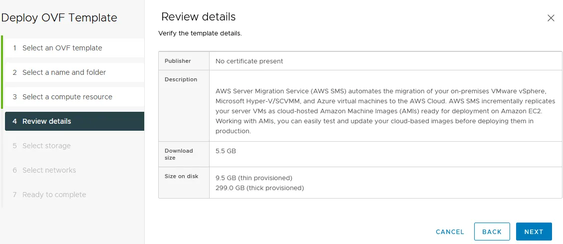 Once you have configured an IAM user with the appropriate permissions, you should install the AWS Server Migration Service Connector (AWS SMS Connector). The SMS Connector is distributed as an OVA template to deploy a VM in VMware vSphere. You can consider this VM a virtual appliance.