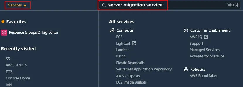 - Click Services > Server Migration Service. You can type server migration service in the search bar.