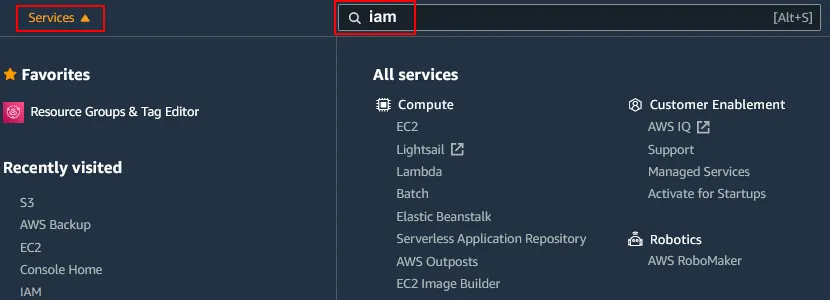- Go to Services > Security, Identity & Compliance > IAM. As an alternative, you can type IAM in the search bar of the Services menu.