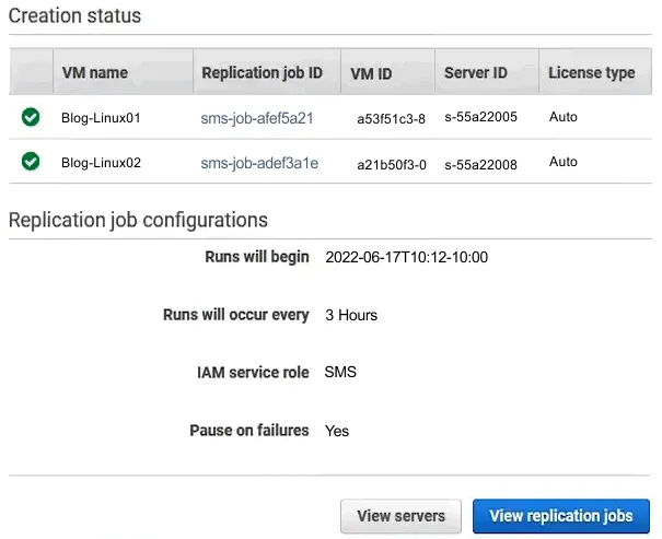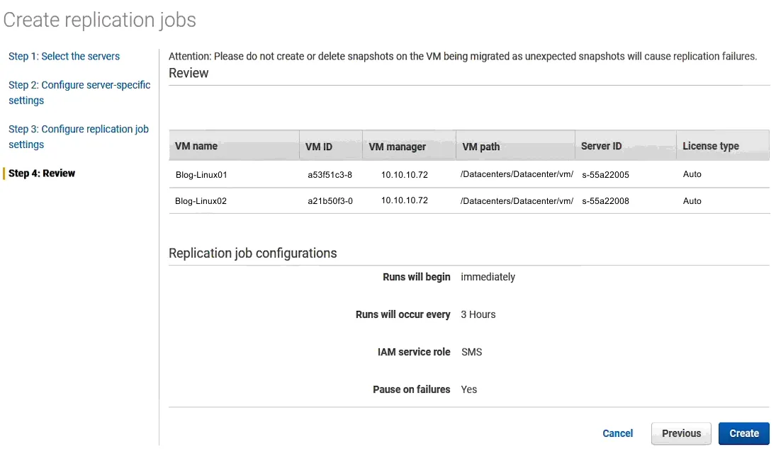 - Review settings and click Create to start VM replication for VMware migration to AWS.