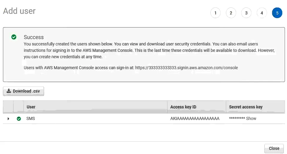 - You should see the Success message notifying you that you have successfully created a user. Write down (copy) and save the access key ID and secret access key to a safe place. You can click the Download .scv button to save credentials as a CSV file.