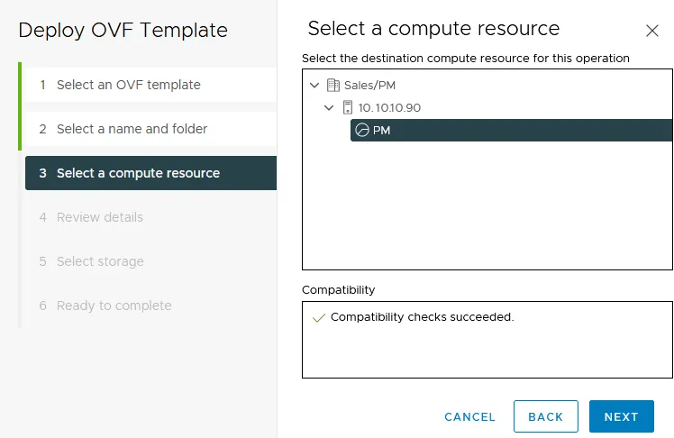 - Select a compute resource. Select an ESXi host, cluster, or resource pool to run the VM.