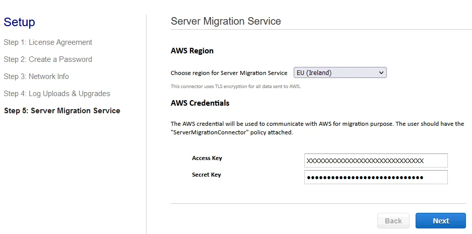 - Server Migration Service. Select an AWS region, for example, EU (Ireland).Enter the AWS credentials you saved after creating the IAM user, that is the Access Key and Secret Key.