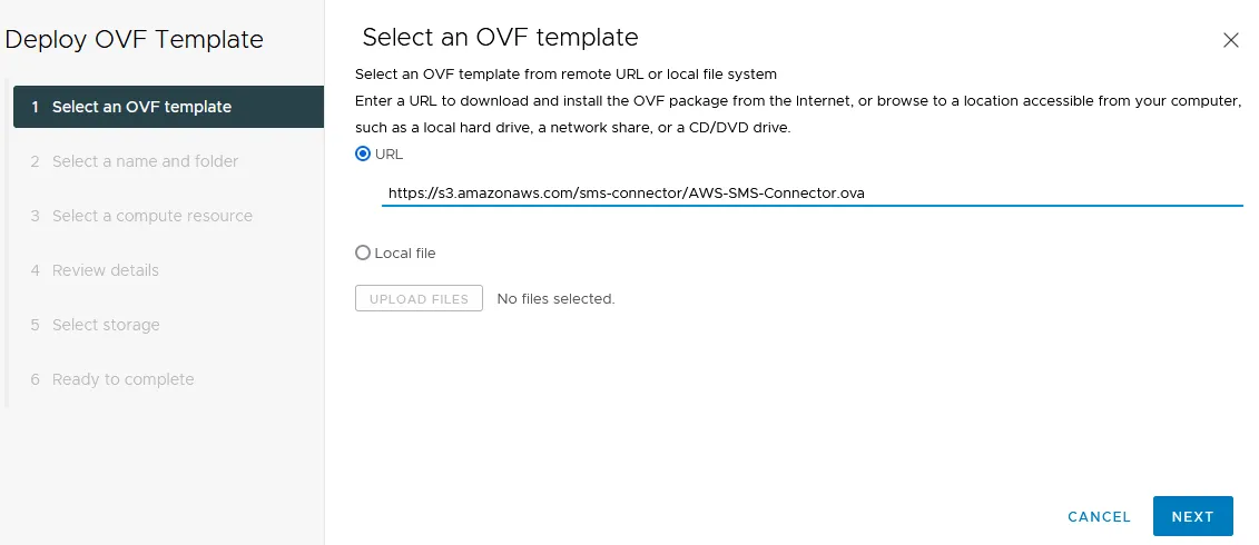 - Select an OVF template. You can paste a direct link (URL) to the AWS-SMS-Connector OVA file (https://s3.amazonaws.com/sms-connector/AWS-SMS-Connector.ova ) if you use the latest vSphere 7 version. Otherwise, you may get an error.he most reliable method is to select and upload a local file from your disk. Select Local file and click Upload files (browse the file when prompted).Click Next at each step to continue.