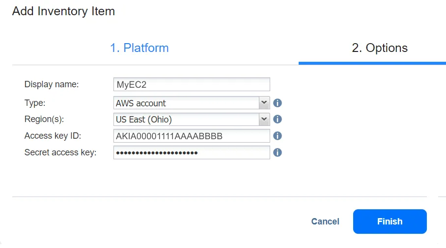 Adding EC2 instances to the Inventory is as easy as adding a VMware vCenter server. To discover existing EC2 instances, You just need to enter an access key ID and a secret access key from your AWS account. To back up instances, you should deploy the NAKIVO Transporter in AWS. The region where the Transporter is deployed must be the same as the region with the EC2 instances you need to back up.