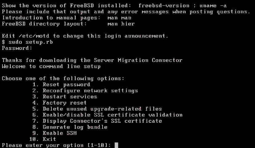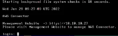 Launch a web console or VMware Remote Console to open the user interface of the operating system running AWS Connector. AWS Connector is running on FreeBSD with the command line interface. Check the IP address of the AWS Connector VM (10.10.10.27 in our case).