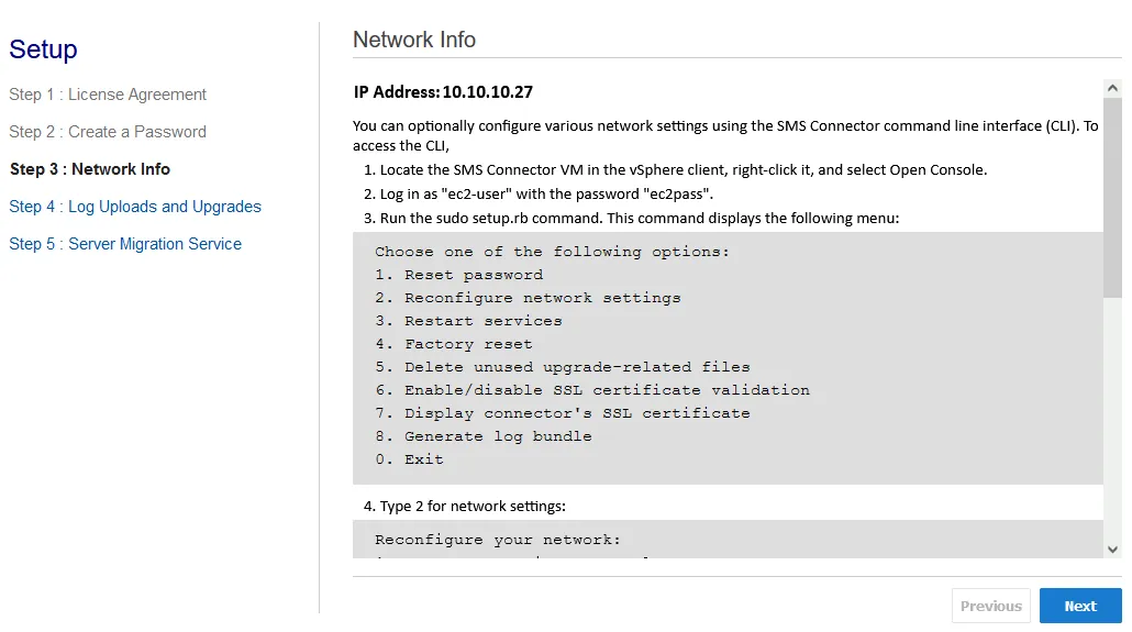 - Network info. The current IP address assigned to a virtual network adapter of the VM is displayed on this screen. You can log in to the command line interface of the SMS Connector (by using VMware Remote Console or Web Console) and change the network configuration of the VM.Use these default credentials to log in: