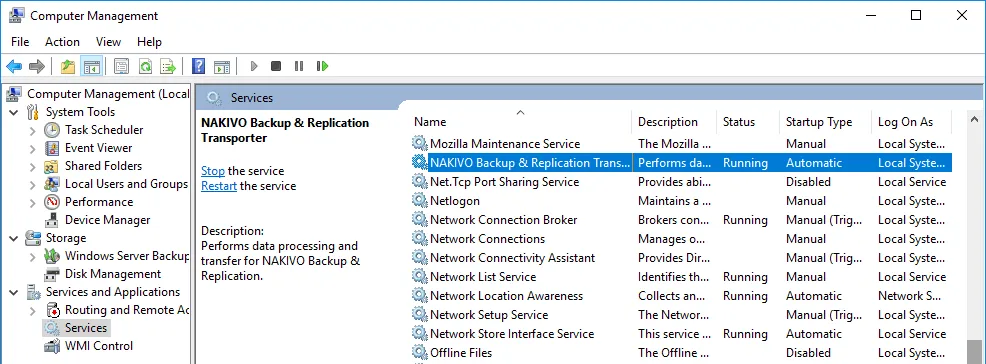 To ensure that the Transporter is running, you can check the Transporter service (NAKIVO Backup & Replication Transporter) in the services snap-in (services.msc) in Computer Management > Services and Applications > Services.