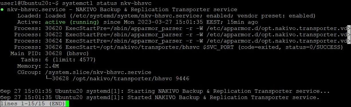 - Once the Transporter (with the name is nkv-bhsvc) is installed, you can check the Transporter service status with the command (in Ubuntu):