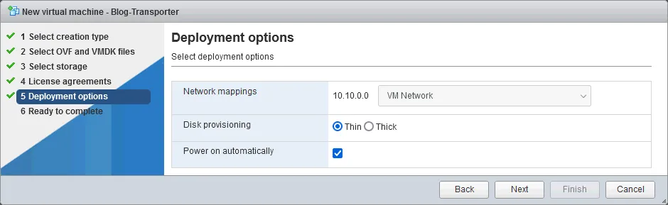 - Deployment Options. Select a network to which to connect the Transporter VM, select the virtual disk provisioning type, and select whether to power on the VM automatically after completing the installation.