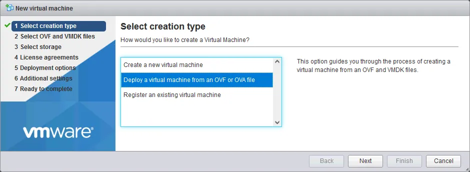 - Select creation type. Choose Deploy a virtual machine from an OVF or OVA file. Click Next at each step of the wizard to continue.