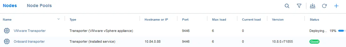 - Wait until the Transporter is deployed on the selected remote host. You can see the node status and deployment progress as shown in the image below.