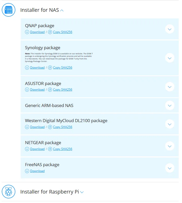 Select Installer for NAS in the NAKIVO download page to expand the download options. Select your NAS vendor, expand the downloading options, select the Transporter, and click the appropriate download link.