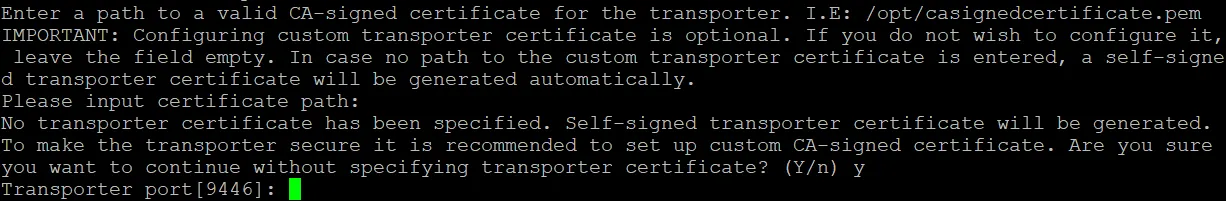 No transporter certificate has been specified. Self-signed transporter certificate will be generated. To make the transporter secure it is recommended to set up custom CA-signed certificate. Are you sure you want to continue without specifying transporter certificate? (Y/n)