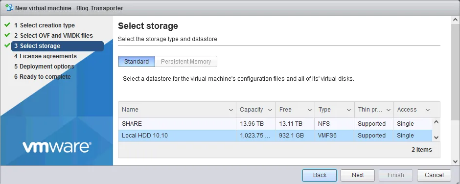 - Select storage. Select a datastore on the ESXi host where to deploy the Transporter.