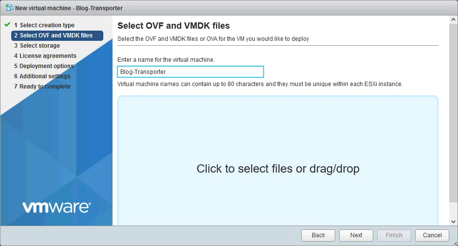- Select OVF and VMDK files. Enter a name for the virtual machine, for example, Blog Transporter. Click the big button to select the OVA file with the Transporter and select this file from your local machine (not on an ESXi datastore).