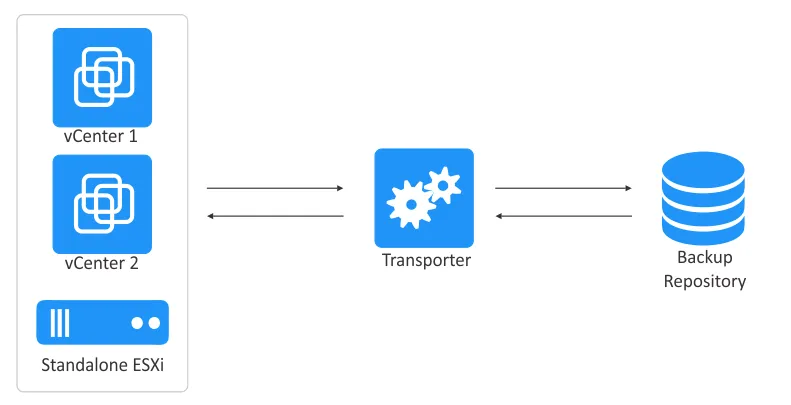 In small and medium environments of 100 machines/instances or less, a single Transporter can be enough per site. A single Transporter can back up, replicate, and recover multiple VMs from multiple vCenters or standalone ESXi hosts (when used in a VMware vSphere environment). In other words, you don’t need to install the Transporter on each VM or ESXi host that you want to protect. As long as the Transporter is deployed somewhere in your infrastructure, access to your hosts and backup repositories is possible.
