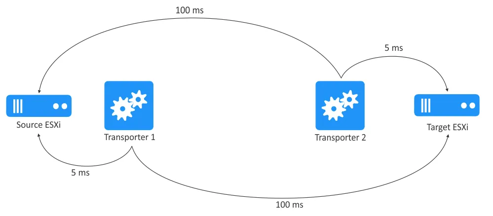 If you have more than one Transporter, you must determine which one should be used for reading data from the source host and which one should be used for writing data to the target host. By default, NAKIVO Backup & Replication determines the Transporter to be used based on host proximity (measured with ping round trip time), as shown in the image below. For this reason, the ICMP protocol must be allowed in the firewall to send ping request/response messages.