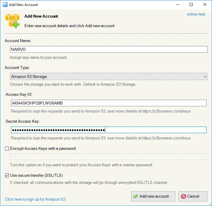 Hit Add new account to open the main window of S3 Browser and connect to Amazon S3 storage. Now you can work with Amazon S3 Browser.
